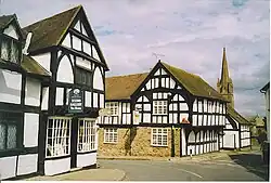 The triangular marketplace was infilled in the 14th century owing to building pressure, as the range of buildings that used to be in the surviving one between Broad Street and Portland Street (all now destroyed) allegedly contained some fabric of that age.[51] However, the original infill consisted of two parallel rows separated by three narrow streets. The easternmost street and the eastern row were both lost in 17th century redevelopment, but the step in the eastern Broad Street frontage is the ghost of the latter.[52] Six high-quality timber-framed buildings of the 14th century in the town survived to be listed in the 20th century.[53]