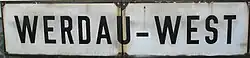 Although the Werdau–Wünschendorf–Weida section was opened on 29 August 1876, the halt (Haltepunkt) of Werdau West was opened on 1 February 1916 with the laying of the route through the urban area of Werdau. The station was closed with the abandonment of rail traffic between Werdau and Wünschendorf (Elster) on 30 May 1999. The dilapidated wooden entrance building and the platforms are still in place, but while the station sign still existed in 2006,[7] it has now disappeared. The halt is located in the western part of its track system. The street that leads to the halt, called Straße zum Westbahnhof (street to the West station), marks the former station. Werdau West is the starting point of the Werdauer Waldbahn, which is operated as a museum railway to Seelingstädt.[8]