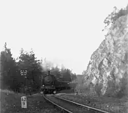 The line was later converted to two tracks and upgraded to a main line in places, between Triebes and Zeulenroda in 1913 and over parts of the whole Werdau–Weida–Mehltheuer line in the 1930s, for example between Loitsch-Hohenleuben and Triebes.[3] In the process, the two signal boxes in Loitsch-Hohenleuben and the northern signal box in Triebes were rebuilt in the 1930s.[2]