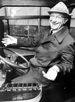 ![]() Werner Heubeck behind the wheel of an Ulsterbus Leyland Tiger on the day of his retirement, 1988. | |