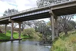 The Werribee River is a perennial river of the Port Phillip catchment that is located on the expansive lowland plain southwest of Melbourne, Victoria, Australia. The headwaters of a tributary, the Lerderderg River, are north of Ballan near Daylesford and it flows across the basalt plain, through the suburb of Werribee to enter Port Phillip. A linear park follows the Werribee River along much of its course. In total the Werribee River completes a journey of approximately 110 kilometres (68 mi).[5]