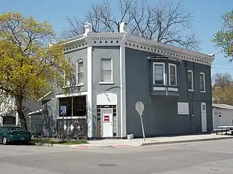The neighborhood tavern was and is a fixture in what was a predominantly working-class German neighborhood of Davenport.[2] This two-story commercial building capitalizes on its corner location by way of the building's main entrance that was placed in a chamfered corner. The oriel window on the east side indicates the location of the residential space above the tavern, which was a common feature in many of Davenport's small commercial buildings from the 19th and early 20th century. The structure is composed of brick, built on a stone foundation. Its primary decorative feature is the metal cornice, with dentil molding, finials, and ornamental frieze.