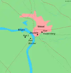 The Wesel Citadel is the largest intact fortification system of the Rhineland, built 1688–1722 in Wesel. It was built according to plans by Johan de Corbin, in the form of a pentagonal star, with each point of the star being a bastion. The citadel was the core of the fortress of Wesel, and is currently used as a cultural centre.