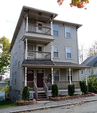 The Wesley Davis Three-Decker is a historic triple decker house in Worcester, Massachusetts. It is a well-preserved example of a Stick-style building that was typical of the early phases of triple-decker construction in the city. This house was built c. 1890; its first documented owner was Wesley Davis, a doctor who did not live in the immediate area. Subsequent owners, like many of the building's occupants, were employed in and around local factories. The building follows a typical side hall plan, and is noted for its porch, which extends the full height of the building over one of the front bays, and has retained all of its original decorative woodwork.[2]