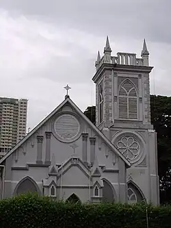 The church was constructed in the Gothic architectural style, designed by C.W. Barnett and built by Ah Chiang. It has two entrances, one on Burmah Road under a porch, and the other facing Anson Road, with a portico, under the tower. The rectangular tower, which is finished with pinnacles, is 20 feet square, 60 feet high, and was designed to house a bell.[7][2][5]