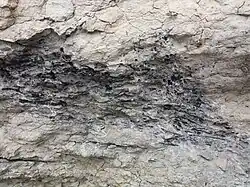 A notable feature of the formation are the so-called "plant debris beds". These consist of a basal matrix supported conglomerate, grading upwards into grey mudstone with lignitic plant debris, including large trunk fragments of the extinct conifer Pseudofrenelopsis present in the upper portion. These were formed by sheet flood deposits induced by storms that filled pre-existing topographic lows like oxbow lakes and abandoned channels in the floodplain depositional environment.[16] The debris beds do not form a continuous horizon throughout the formation, but are laterally extensive over tens of metres. Many of the wood fragments in the debris beds are cemented together with large nodules of pyrite, suggesting depositional conditions were anoxic.[17] Most fossils within the formation are associated with the debris beds. Vertebrate fossils are mostly disarticulated individual bones and teeth, suggesting a long subaerial exposure prior to burial, though the bones lack abrasion, suggesting that they had not been significantly transported. Partial skeletons also sometimes occur, but are uncommon. Autochthonous siderite nodules are also present, which encase some of the fossils.[16] Plant debris beds also exist within the Swanage section, and one of these horizons has yielded microvertebrate remains.[10]
