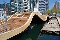 Undulating wave shapes are also part of West 8's designs, with DTAH, for a series of wavedecks on Toronto's waterfront. The wooden-planked walkways are part of a redevelopment project overseen by Waterfront Toronto. The first three of the four planned wavedecks (Rees wavedeck, Spadina wavedeck, and Simcoe wavedeck) have been completed.