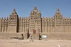 As Islam spread into Africa, West African mosques developed to share certain unifying architectural characteristics, namely the utilization of building materials localized to the environment. One of the main ways we see this in the mosques is through their construction, as they are largely built with mud brick.[2] Sub-Saharan African mosques are formed with materials that lack long term durability.[2] Due to this building technique, more frequent maintenance is necessary. The mosques are also built with wood or palm sticks that protrude from their edifice to help stabilize the structure and act as scaffolding for upkeep due to the mud's reaction in the humid climate of West Africa.[2]