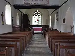 Later on, to remind all the villagers who was king, King James I had his royal coat of arms painted in the Church. This coat of arms can still be seen to this day if one stands in the gallery and looks towards the altar. The motto on the arms reads "Exurgat Deus Dissipenter Ininice", this is the opening line of Psalm 68[42] (Let God arise and let His enemies be scattered). Opposite James's arms is a set of Hanoverian arms acquired in 1816.[43]