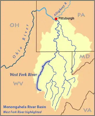 ![]() Map of the Monongahela River basin, with the West Fork River highlighted | |
