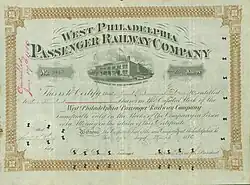 The West Philadelphia Passenger Railway was an early commuter rail that opened on July 2, 1858.[1] Initially tracks ran from 3rd Street to 41st street along Market Street.[1] Tracks ran over the Permanent Bridge that was completed in 1887.[1][2] Passengers were transported by "horse-drawn omnibuses".[1] The railway was the second street railway to be chartered in Philadelphia when it was chartered on April 28, 1857.[3] Portions of the railway leading to Darby followed a route similar to that of SEPTA's Route 11 today.[3] People of color were not allowed to use the railways until an Act of the Pennsylvania General Assembly in 1867; however, they were permitted to stand on the platform with the driver.[3]