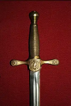 The sword is based on that used by the US Army when USMA was founded (16 March 1802). The first swords used were legacies from the Army following the formation of the Academy in 1802 and are believed to have been similar to the 1767 French Grenadier Sergeant's sword used in the Revolutionary Army. The first swords procured for the Academy were delivered in 1838.[4]