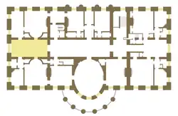 White House architect James Hoban's initial 1793 plan and 1814 reconstruction design both placed a double Imperial stair form here, with a single stair rising from the ground floor at the terminus of the Cross Hall and dividing to two stairs returning double runs to the east in the present space.[1] Hoban's original plan was not built as designed, as Thomas Jefferson engaged Benjamin Henry Latrobe in 1803 to reverse the orientation of the stair. Latrobe's alteration placed a double run on either side rising from the west to a landing on the east and a single run returning west to the second floor.[2]