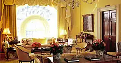 Eleanor Roosevelt, who screened the area off from the Central Hall, particularly enjoyed it. In the subsequent Truman reconstruction, architects enclosed the hall with solid partitions and created a living room.[3] At that time, the kitchen elevator was extended to this floor, and the door opened into this room; the Kennedy restoration rerouted it into the little hall when the room to the north was converted into the Family Kitchen. During the Truman reconstruction the east wall was rebuilt to include framed double doors allowing the room more privacy.