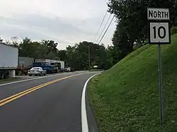 West Virginia Route 10 is a north–south route from Cabell County to Mercer County in the western and southern regions of West Virginia. Mostly a two-lane, winding highway with no shoulders, Route 10 is considered to be one of substandard design when compared to modern standards. Nevertheless, it serves as a major arterial highway in the state, carrying a substantial amount of traffic volume. Tractor-trailers have a particularly difficult time negotiating many of the route's sharp, hairpin curves.