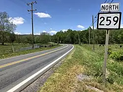 West Virginia Route 259 (WV 259) is a state highway in the U.S. state of West Virginia. The state highway runs 45.6 miles (73.4 km) from the Virginia state line near Mathias north to the Virginia state line at High View. At both termini, the road continues as Virginia State Route 259 (SR 259). WV 259 passes through Hardy and Hampshire counties and runs concurrently with WV 55 on Corridor H between Baker and Wardensville.