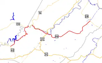 The two segments are connected by a two-mile (3 km) portion of MD 135 and MD 36 in Maryland's Allegany County.