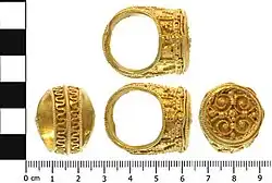This large gold ring has a round bezel set on top of a hollow, box-like construction and is covered with complex decoration made of gold granulation and filigree. It has been suggested that the filigree decoration might represent a vine, a popular motif in religious imagery. The hollow construction when moved appears to have an object inside the hermetically sealed chamber; x-ray examination shows that the object may be organic, and one interpretation is that this ring was used to hold a relic.[7] There are a small number of similar rings which mean that its production may date to the ninth, tenth or eleventh centuries.[7]
