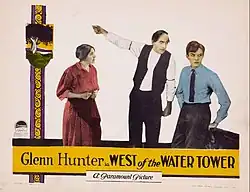 West of the Water Tower is a 1923 American silent comedy drama film produced by Famous Players–Lasky and distributed by Paramount Pictures. It was directed by Rollin S. Sturgeon and is based on the novel of the same name by Homer Croy. Glenn Hunter and May McAvoy are the stars of this film.[1][2]