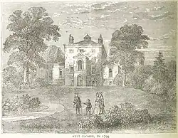 To the west of Woodlands House was Westcombe Manor, former family seat of the Ballards,[7] the Lambardes,[8] and Sir Theophilus Biddulph (1612–1683; see also Biddulph baronets). The original house was rebuilt in 1723 by Sir Gregory Page, and let to tenants who included Lavinia Fenton, Dowager Duchess of Bolton, who died at the house in 1760[9] (Peachum Road is named after a role, Polly Peachum, played by Fenton as an actress). In 1796, the building was described in Daniel Lysons' Environs of London: