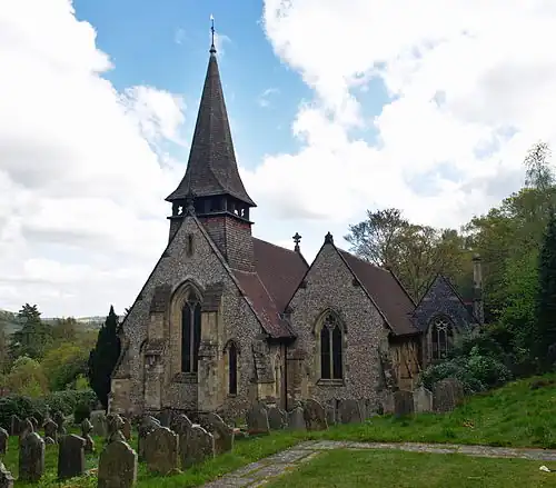 Many pre-1800 listed buildings, including some that are thatched, are in the lanes leading off the A25, including Leslie Howard's (actor 1893–1943) Stowe Maries, built in the 1550s, in Balchins Lane. Milton Street and Westcott Street lead to several more old buildings.[10] The Church of the Holy Trinity is Grade II listed because it was designed in 1851, by Sir George Gilbert Scott, and is made of knapped flint with ashlar quoins/dressings. Its spire has a clock, striking bell and weather vane, and there is a small western turret.[11] Charles Barclay of Bury Hill gave equivalent to £138,301 in 2023 for it to be built, and Lady Mary Leslie the same, as an endowment. The clock was installed to commemorate the Jubilee of 1887. The parsonage was built at the expense of Barclay and the secular Westcott School was built by subscription in 1854. The infant school was also built by subscription, in 1882.[9]
