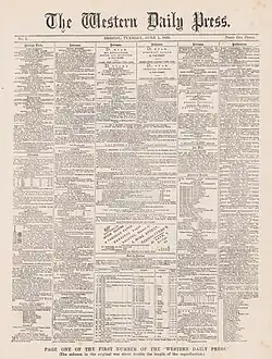 It was founded by Scottish businessman Peter Stewart Macliver and Newcastle journalist Walter Reid and first published on 1 June 1858.[2] Macliver went on to found the Bristol Observer.[3] Reid took over the Western Daily Press in 1891 and ran it till the early 20th century.[4]
