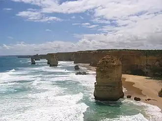 The Twelve Apostles, a collection of natural limestone stacks standing just off shore near Port Campbell. Their proximity to one another has made the site a popular tourist attraction.