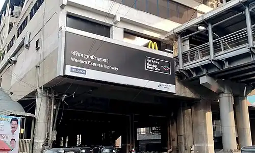 Western Express Highway is an elevated metro station on the Blue Line 1 of Mumbai Metro serving the Andheri suburb of Mumbai, India. It is the flagship station of the line[2] and was opened to the public on 8 June 2014.