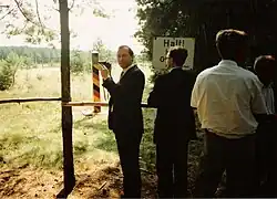 On 12 August 1989, a delegation from the Western Goals Institute attended an anti-communist demonstration at Mölln, near Lübeck which over 20,000 people attended. The rally was organised by Die Deutschen Konservativen e. V., led by Joachim Siegerist, now a Latvian parliamentarian.[34]
