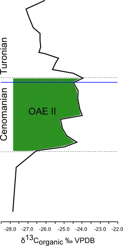 Western Interior Seaway strata preserve the positive13Corganic excursion during Oceanic Anoxic Event II, meaning there was excellent preservation of organic carbon. However, other evidence is conflicting. Molybdenum, an oxygen-sensitive trace metal, will be present in unoxidized form in strata only if there is anoxia. One study showed lack of molybdenum in Oceanic Anoxic Event II strata.[8] Other studies demonstrated the persistence of benthic organisms that could not live in anoxic settings throughout the entirety of Oceanic Anoxic Event II.[7] Consequently, there is a difference in opinion of the relationship between benthic oxygen conditions and what a positive shift of the 13Corganic curve represents. Anoxia in the Western Interior Seaway during Oceanic Anoxic Event II is still an enigma.