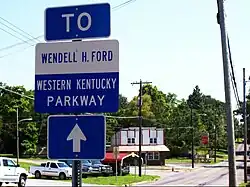 The Wendell H. Ford Western Kentucky Parkway is a 98.5-mile-long (158.5 km) freeway running from Elizabethtown to near Nortonville, Kentucky. It intersects with Interstate 65 (I-65) at its eastern terminus, and I-69 at its western terminus. It is one of seven highways that are part of the Kentucky parkway system. The road was renamed for Wendell H. Ford, a former Kentucky governor and United States senator, in 1998. Previously, it was simply the Western Kentucky Parkway, and often called the "WK Parkway" or "the WK" because of the initials that were once used on its signs prior to the 1998 renaming.[2] The parkway carries the unsigned designation Kentucky Route 9001 (WK 9001) for its entire length.