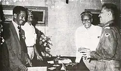 In 1944, Jan van Eechoud set up a school for bureaucrats in Hollandia (now Jayapura). One early headmaster of the school was Soegoro Atmoprasojo, an Indonesian nationalist graduate of Taman Siswa and former Boven-Digoel prisoners, in one of these meetings the name "Irian" was suggested. Many of these school early graduates would go on to found Indonesian independence movement in Western New Guinea, while some went on to support Dutch authorities and pursue Papuan independence.[81] In December 1945, Atmoprasojo alongside his students were planning for a rebellion, however Dutch authorities would be alerted by a defecting member of Papuan Battalion on 14 December 1945, utilising forces from Rabaul, Dutch authorities would also capture 250 people possibly involved in this attack.[82][83][84] The news of Indonesian independence proclamation arrived in New Guinea primarily through shipping labourers associated with Sea Transport Union of Indonesia (Sarpelindo), who were working for ships under the flag of Australian and the Dutch.[85] This led to the formation of the Komite Indonesia Merdeka or KIM branch in Abepura, Hollandia in October 1946, originally an organization for Indonesian exiles in Sydney. It was led by Dr. J.A. Gerungan, a woman doctor who led an Abepura hospital, by December 1946, it came to be led by Martin Indey. KIM was one of the first Indonesian nationalist groups in New Guinea, whose members were mostly former associates of Soegoro.[85] Simultaneously another separate Indonesian nationalist movement in New Guinea formed when Dr. Sam Ratulangi, was exiled at Serui, along with his six staff by the Netherlands Indies Civil Administration on 5 July 1946. In exile he met with Silas Papare who was also exiled from a failed Pagoncang Alam led rebellion to free Atmoprasojo, on 29 November 1946, an organization called Indonesian Irian Independence Party (PKII) was formed.[85] A year later, on 17 August 1947, former students of Soegoro and others would held a red and white flag-raising ceremony to commemorate the Indonesian independence day.