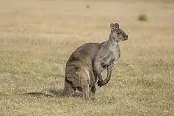 The western grey kangaroo (Macropus fuliginosus), also referred to as a western grey giant kangaroo, black-faced kangaroo, mallee kangaroo, sooty kangaroo and (when referring to the Kangaroo Island subspecies) Kangaroo Island grey kangaroo,[4] is a large and very common kangaroo found across almost the entire southern part of Australia, from just south of Shark Bay through coastal Western Australia and South Australia, into western Victoria, and in the entire Murray–Darling basin in New South Wales and Queensland.