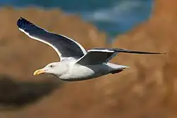 The western gull is a large gull that can measure 55 to 68 cm (22 to 27 in) in total length, spans 130 to 144 cm (51 to 57 in) across the wings, and weighs 800 to 1,400 g (1.8 to 3.1 lb).[3][4] The average mass among a survey of 48 gulls of the species was 1,011 g (2.229 lb).[5] Among standard measurements, the wing chord is 38 to 44.8 cm (15.0 to 17.6 in), the bill is 4.7 to 6.2 cm (1.9 to 2.4 in) and the tarsus is 5.8 to 7.5 cm (2.3 to 3.0 in).[3] The western gull has a white head and body, and upperparts or mantle is dark grey. The head generally remains white year-round, developing little to no streaking patterns in northern populations during the nonbreeding phase (basic plumage). It is debatable the extent of head markings can be found in pure Western Gulls as they form a hybrid zone with the glaucous-winged gull (Larus glaucescens) which has a more extensive hood. It has a large and bulbous-tipped yellow bill with a red subterminal spot (this is the small spot near the end of the bill that chicks peck in order to stimulate feeding). The eye colour varies, averaging pale yellow in southern populations and darker in northern populations. It closely resembles the slaty-backed gull (Larus schistisagus) of Asia, but the latter species has paler eyes, a straighter bill, deeper pink legs and eye orbitals, as well as conspicuous white spots ("string of pearls") on the inner primaries when seen in flight not seen in Western Gulls. Western gulls take approximately four years to reach their full plumage,[6] their layer of feathers and the patterns and colors on the feathers. In adult plumage, The largest western gull colony is on the Farallon Islands, located about 26 mi (40 km) west of San Francisco, California;[7] an estimated 30,000 gulls live in the San Francisco Bay area. Western gulls also live in the Oregon Coast.[8]