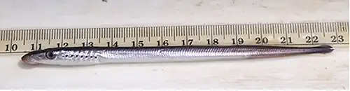 They have no scales, and are typically dark brown in on their back, sides, and tail with yellow bellies and silver around the head, gill openings and lower sides.[3] Characteristic of lamprey, they lack pectoral, pelvic, and anal fins. Ammocetes are lightly pigmented with a pale head and tail.[8][9] Immature adults can be characterized by their silver coloration and sharp teeth.[10] As they mature, their two dorsal fins eventually connect.[9]