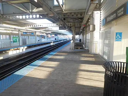 By 1985, Western and its adjacent stations were singled out for being among the "L" stations in the worst repair.[25] The CTA began plans to overhaul the station and expected to finish the renovation by 1988. Nothing came of these plans, although renderings were ready by the early 1990s. The CTA again announced in September 1999, that work would be done to the station, which started in June 2000 and was completed by September 2001, before ending in November 2001. The Art Deco facade, which was eligible for the National Register of Historic Places, and original 1895 northern wall were preserved, but the rest of the station house was demolished, as were the platforms and their canopies. Wider wooden platforms were constructed, and a new canopy was constructed that spans the whole length and width of both platforms, with skylights down the center above the tracks. The new station house interior was more spacious and faced a plaza to the station house's south, and contained elevators making the station accessible to passengers with disabilities.[24]