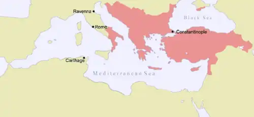 - ^ By Rome's central location at the heart of the Empire, "West" and "East" were terms used to denote provinces west and east of the capital itself. Therefore, Iberia (Portugal and Spain), Gaul (France), the Mediterranean coast of North Africa (Tunisia, Algeria, and Morocco) and Britannia were all part of the "West". Greece, Cyprus, Anatolia, Lebanon, Syria, Israel, Palestine, Egypt, and Libya were part of the "East". Italy itself was considered central, until the reforms of Diocletian dividing the Empire into true two halves: Eastern and Western.