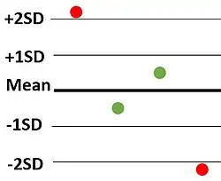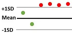 The Westgard rules are a set of statistical patterns, each being unlikely to occur by random variability, thereby raising a suspicion of faulty accuracy or precision of the measurement system. They are used for laboratory quality control, in "runs" consisting of measurements of multiple samples. They are a set of modified Western Electric rules, developed by James Westgard and provided in his books and seminars on quality control.[1] They are plotted on Levey–Jennings charts, wherein the X-axis shows each individual sample, and the Y-axis shows how much each one differs from the mean in terms of standard deviation (SD). The rules are:[2]