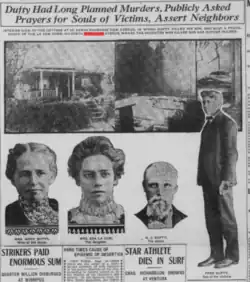 - ^ "Maniac Kills Daughter and Son With Ax: Wounds Wife and Tries to Commit Suicide". Los Angeles Herald. August 14, 1908. pp. 1–2. Retrieved June 14, 2016.