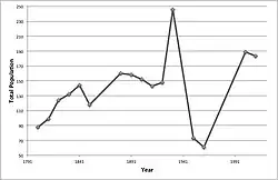 The earliest record of Westley's population appeared in the 1068 Domesday Book, the population is recorded as 21 households[8](population was measured by heads of families because The Domesday Book was written predominantly for the assessment of tax) assuming average family size is 4 the total population in 1068 was approximately 84 which is relatively large compared to neighbouring settlements.[8] The earliest record of Westley's population in the national census is 1801,[15] with a total population of 88.[15] The population grew by an average of 14 persons every 10 years between 1811 and 1841.[12] There are two significant population decreases on the adjacent time series: 1841–1851; which correlates to a reduction of 3 houses in the village during such years,[16] and 1931 – 1951; which can be interpreted by a boundary change of 1240 to 685 acres between those years[17] with much of the population being absorbed into Bury St Edmunds. The 2001 census recorded a total population of 189[18] and in 2011 the census recorded a small drop to 183,[1] giving Westley a population density of 0.5 persons per hectare,[1] this is 8 times less than the average population density of England[1] suggesting that Westley is a sparse settlement in comparison.