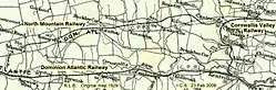 In 1912 construction began by the Dominion Atlantic Railway on a 14.8 mile railway line to Weston from Centreville to improve transportation for local farming. On December 1, 1914 this Centreville to Weston Branch was inaugurated and was known as the North Mountain Railway, sometimes called the CVR. Weston was its western terminus. The railway triggered several local industries. Two apple warehouses and a station were built in Weston to pack and ship the large volume of apples produced in local orchards. A cooperage was also built beside the tracks with a basket-making mill just to the north. A large triangle of track called a wye was used to reverse trains which also included a small locomotive shed and water tank. Rail service lasted until 1961 when the North Mountain Line closed due to the rise of highways and truck traffic. The station was demolished in 1961, followed in later years by the apple warehouses, although the roadbed of the railway and wye can still be seen.[1]