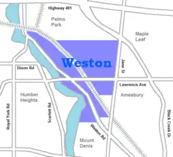Weston is a neighbourhood and former town in Toronto, Ontario, Canada. The neighbourhood is situated in the northwest of the city, south of Highway 401 and Highway 400/Black Creek Drive, east of the Humber River, north of Eglinton Avenue, and west of Jane Street.[1] The eponymous Weston Road, just north of Lawrence Avenue is the historic core of Weston, with many small businesses and services. Weston was incorporated as a village in the 19th century and was absorbed into the Borough of York in the late 1960s. York itself was amalgamated into Toronto in 1998. Weston is one of the few former towns and villages in Toronto located in a generally suburban setting, although it is contiguous with the inner city to the southeast along Weston Road. It is also one of the few not developed as a planned satellite town, as is the case with Leaside or New Toronto.