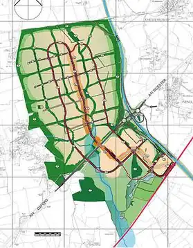 Housing was to be located in a compact, high population density urban core of 220 hectares (540 acres).