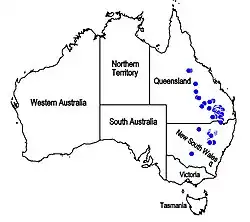The species occurs in northern New South Wales and southern Queensland, on deep, gravel-rich, sandy soils, in mallee woodland and dry sclerophyll forest.[1]