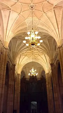Between 1940 and 1950 Candler constructed his version of Hubert L. Eaton’s memorial park at West View, the Garden of Memories. In 1943, construction started on Westview Abbey. Designed by California-based architect Clarence Lee Jay and mausoleum builder Cecil E. Bryan, the abbey contains 11,444 crypts and is designed in the Spanish Plateresque architectural style. The structure is composed of a mausoleum and an administration building. The mausoleum's lower and main floors are complete, but much of the third floor has yet to be built out.