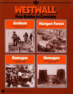 Westwall: Four Battles to Germany is a collection of four board wargames published by Simulations Publications (SPI) in 1976 that simulate battles in Europe in late 1944 and early 1945 during World War II.