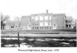 The first superintendent of the newly consolidated Westwood CSD was E.V. Heacock. He served for five years. The first people on the school board were President Warren Johnson of Sloan, Orval K. Cox of Hornick, Cyr Miquelon of Salix, Norman Stickney of Smithland, Alvin Sulsberger of Holly Springs.[4] The board took one year to get organized while the other schools kept their education going. It took 17 years to get the new school building vote passed. The new K-12 Westwood building was built in 1988.[5] Upon consolidation, the name “Westwood” was chosen for a community likeness towards the UCLA Bruins who are located in the Westwood region of Los Angeles, California. Hence, the Columbia Blue and Gold Colors were also adopted. In 1995, the school colors changed from Columbia Blue and Gold to Royal Blue and Gold. The mascot “Rebel” was named after a high school student's dog. The student’s name was Rick Watson and he entered the name “Rebel” into a contest and it was selected as the winner. “Willie The Rebel” is the mascot along with the icon, “swords.” Diane Miller designed and drew Willie The Rebel.[6]