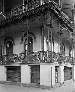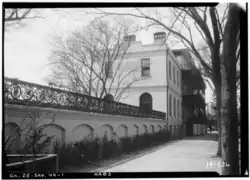 The house was at 425 West Oglethorpe Avenue, at its junction with Martin Luther King Jr. Boulevard;[1][2] its original address was 215 South Broad Street.[3] It was originally built as a three-storey stucco building for Anthony Barclay, next door to a mansion owned by Mary Magdalene Marshall. Marshall's adopted daughter, Margaret, married Anthony's son, Adalbert in 1855.[4] From 1837, the property was owned by Margaret Telfair. Augustus Wetter, who acquired it in 1857 on his marriage to Alberta Telfair, had it remodeled and added cast iron balconies by Wood & Perot of Philadelphia, which included 50 medallions portraying poets, artists, and statesmen.[1] The ironwork cost $100,000 and had been created for the Georgia state capitol at Milledgeville, but was reportedly rejected as too expensive.[5] In 1862, during the Civil War, the house was briefly the headquarters of Confederate Army general Robert E. Lee, and Confederate President Jefferson Davis was a friend of Wetter's and a frequent visitor.[1]