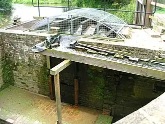 Having completed a multi-million pound B2133 road bridge-centred project (see below), restoration has continued northwards. Devil's Hole Lock (lock 6) had been partially destroyed by the Canadian army as part of a training exercise in 1942. It has been rebuilt and extended to take 72-foot (22 m) narrow boats. The lock was reopened on 17 April 2010, and the opening ceremony was carried out by Colonel Paul Rutherford, the Senior Army Adviser to the Canadian High Commissioner.[24] Southland Lock (lock 7) required significant rebuilding, as many of the original bricks were removed in the 1930s, to be re-used by a local religious order.[25] The lock was reopened on 21 June 2014 by Simon Carter, a local landowner with land adjoining this section of the canal.[26] Working parties have since concentrated on the building of Gennets Bridge Lock (lock 8), a major exercise requiring the construction of a new concrete shell, faced with locally made bricks, and a bridge for a bridleway[27] as nothing was left of the original lock structure.