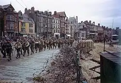 Weymouth's military importance made it a target for German bombing during World War II. The air raids destroyed 1,200 civilian dwellings and killed 76 civilians, and the High Street was so badly damaged that much of it had to be demolished after the war.[2][23] In September 1942 the first full-scale testing of the bouncing bomb was carried out west of the town, on the lagoon behind Chesil Bank.[24][25] Tens of thousands of Allied troops departed Weymouth and Portland for D-Day, bound for Omaha in Normandy. By the time the conflict in Europe had ended, 517,816 troops and 144,903 vehicles had been through the ports.[2]